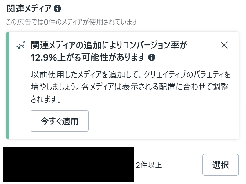なので、常時配信キャンペーンで「関連メディア」を使う場合は、その広告と関連のある広告クリエイティブのみ適用して配信し、様子を見ることも選択肢としてはアリかなと考えます。