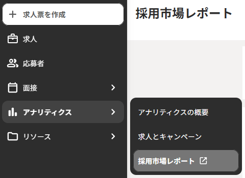 採用市場レポートは採用企業アカウントの左側メニュー、「アナリティクス」の項目の「採用市場レポート」から使用できます。
