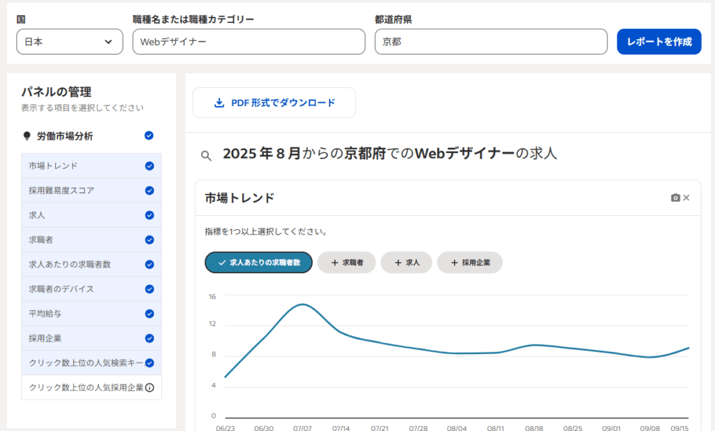 - Indeed採用企業アカウントの「採用市場レポート」を使えば、職種・地域ごとの競合状況や求職者の動向を数値で把握できる。